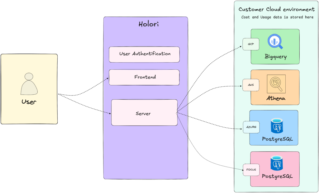 Holori is designed so that all your cost data stays in your cloud environment, stored securely in your PostgreSQL and S3. Holori only has read-only access, ensuring you keep full data ownership and control.